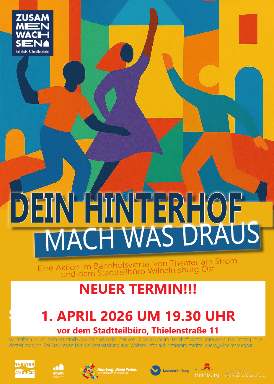 Unter dem Motto „Dein Hinterhof – mach was draus!“ findet am 1. April um 19.30 Uhr eine Aktion von Theater am Strom und dem Stadtteilbüro Wilhelmsburg Ost im Bahnhofsviertel statt. Treffpunkt ist vor dem Stadtteilbüro in der Thielenstraße 11. Die Veranstaltung ist kostenfrei, alle sind herzlich willkommen!
